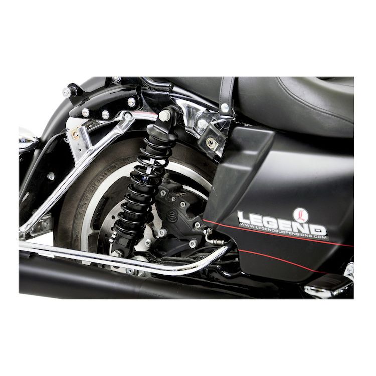 The REVO-A coil shock system is Legend’s take on isolating a bike from road shocks using a conventional coil spring and shock absorber, with an upgrade over the standard REVO shock. Revo suspension achieves a softer, more compliant ride due to softer spring rates. The REVO-A line, like the standard REVO, uses coil springs that are specially wound a few inches longer than a standard spring. When compressed into the shock body, the special spring delivers a “sweet spot” that is noticeably larger and more usable than competitors that yields a great ride over a wide variety of road conditions. The REVO-A’s shock bodies are all aluminum, as well! Heavy-duty versions are available and recommended for riders who ride at or near maximum load capacity more than half the time. REVO-A shocks distinguish themselves from the standard REVO by allowing the rider to adjust the rebound damping characteristics of the shocks.